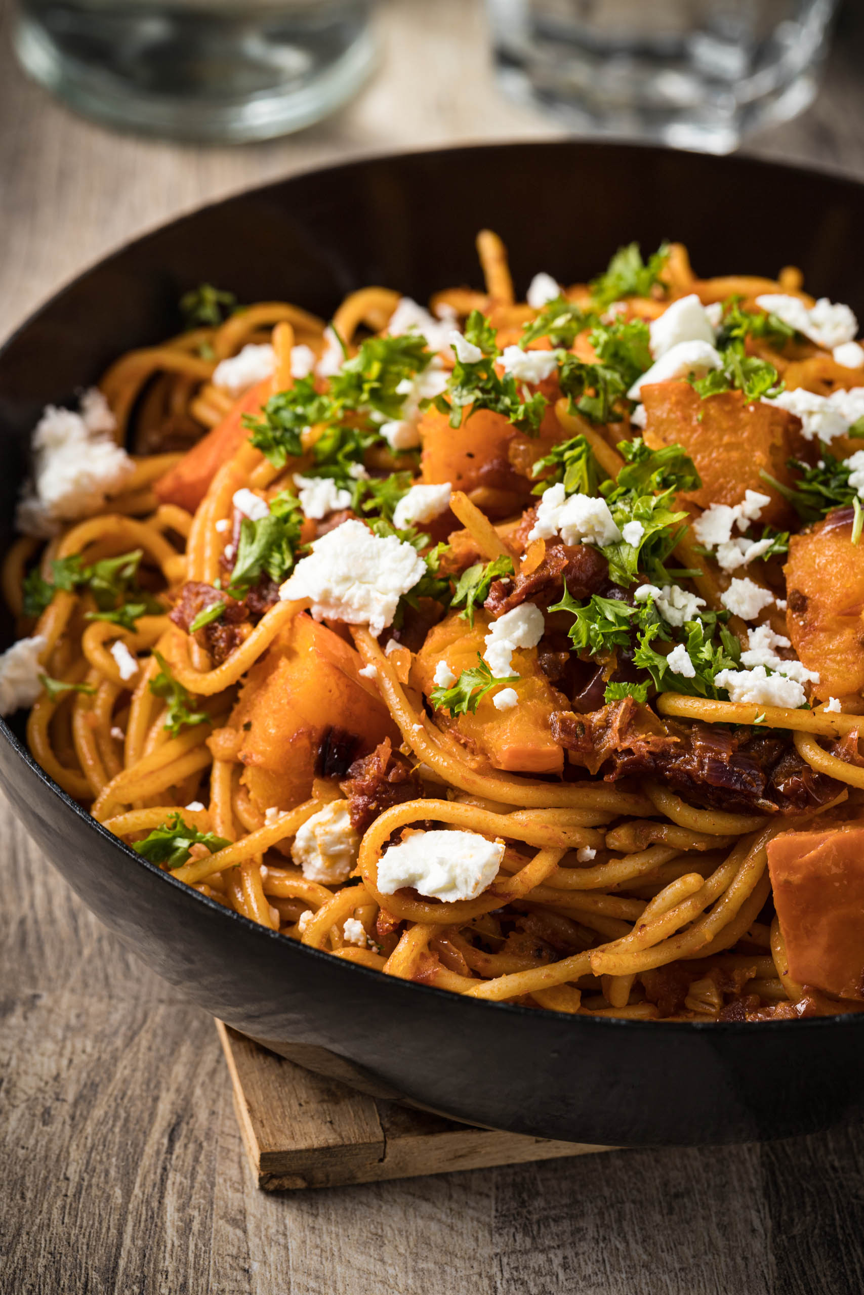 Pumpkin pasta 21 October, 2022 by Martin - No comments This post may contain affiliate links, which are marked for this purpose. As an Amazon Associate I earn from qualifying purchases. Jump to the recipe Pumpkin pasta is the perfect dish for the cold season. When it starts to get uncomfortable outside, we all need comfort food from time to time. For me, a delicious pasta dish with pumpkin and dried tomatoes is at the top of the list. My recipe for pumpkin pasta is not only incredibly tasty, but also super easy and is on the table in about 25 minutes. I love autumn. When the leaves change colour on the trees and the world is wrapped in a golden light in the very early evening, the earth seems to turn more slowly and calmness sets in to our hectic daily lives. When you return to your warm flat after a long walk and have made yourself comfortable on the sofa with a warming stew or pasta dish, the world seems to have become a little bit better. At least for that moment 😉 My recipe for pumpkin pasta is ideal for this. It’s warming, super aromatic and makes you almost forget the hectic and restlessness of everyday life. What ingredients do I need for pumpkin pasta? The hero for this great dish is without a doubt the pumpkin. I prefer to use Hokkaido pumpkin. It is wonderfully easy to use because it does not need to be peeled. The skin becomes soft during cooking and can therefore be eaten without any problems. But the dried tomatoes also add a lot of aroma and flavour to the dish. I use dried tomatoes preserved in oil, which you can buy in jars in any well-stocked supermarket. Otherwise, all you need is some feta, onion, garlic, parsley, tomato paste and olive oil. You can also easily veganise the dish by using a vegan substitute instead of feta. Pumpkin pasta – How is it made? You can find the list of ingredients and all the steps in the recipe card below. For tips, hints and recipe suggestions, just keep reading here. Cut the pumpkin in half and cut into cubes First wash the pumpkin with hot water. Then cut the pumpkin in half and remove the fibre and seeds with a spoon. Now cut the pumpkin first into wedges and then into bite-sized cubes. Hints: To cut the squash into wedges, place the halved pumpkin with the cut side down and use a bread knife or a large knife with a serrated blade. Sometimes Hokkaido pumpkins have small growths. You can remove these with a peeler or knife if you don’t like the look. But you can also eat them without hesitation. Cut the other ingredients into small pieces Separate the leaves from the stalks of the parsley. Then cut the stalks into fine rings and chop the leaves separately. Peel the onion and cut it into fine cubes. Now peel and finely chop the garlic and cut the dried tomatoes into small pieces. Fry the ingredients and put the pasta on Put 1 tbsp olive oil in a non-stick pan and fry the onion and parsley stalks over medium heat until the onion has become translucent. Then add the garlic and fry for a while. Be careful not to brown the garlic too darkly, otherwise it will become bitter. Then add the tomato paste and the dried tomatoes and fry for a while. Remove all the ingredients from the pan and briefly wipe clean with a kitchen towel. Now is the ideal time to put on the pasta. To do this, cook the spaghetti in a large enough pot in salted water according to the instructions on the packaging until al dente. Once the pasta is in the water, fry the pumpkin with 1 tbsp olive oil over a medium heat for about 5 minutes or until it is firm to the bite. Combine all the ingredients and mix well After the pumpkin has been fried until firm to the bite, you can add the onion, garlic, parsley and tomato mixture to the pumpkin in the pan and mix well. By now the pasta should be ready. Drain the pasta, reserving 1 ladle of the pasta water. Add the pasta to the pan with the pasta water and mix everything well. Season to taste with salt and pepper. Serve the pasta Put the pasta on plates or in bowls and add crumbled feta and the chopped parsley leaves on top. Enjoy 🙂 I wish you a lot of fun while cooking. I would be happy if you share this recipe on facebook. Did the post made you want some more? Then maybe one of the following recipes will be the right one for you: Bavarian potato soupCreamy mushroomsVegan Sloppy JoeVegan Currywurst (curry sausage) with homemade sauceQuick and vegan tomato soupStuffed mushroomsPasta salad with mayoVegan banana bread with chocolate chunks Would you like to give feedback or share your thoughts with others? I think it's great. At the end of the post you can read the comments of other guests or write a comment by yourself. Let's go Pasta with pumpkin Print preview Prep time: 25 minutes Serving: 2 servings ½ Hokkaido pumpkin, about 17.5 oz / 500 g 1.75 oz / 50 g sun dried tomatoes in oil 8.8 oz / 250 g spaghetti 1 red onion 2 gloves of garlic 2 tbsp tomato paste 1.15 oz / 30 g feta cheese or vegan substitute 15 parsley stalks, about 0.15 oz / 5 g 2 tbsp olive oil, extra vergin salt pepper Instructions Wash the pumpkin, cut in half and remove the fibres and seeds with a spoon. First cut the pumpkin into wedges and then into bite-sized pieces.Separate the leaves from the stalks of the parsley. Cut the stalks into fine rings and finely chop the leaves. Peel the onion and garlic. Dice the onion and finely chop the garlic. Cut the dried tomatoes into small pieces.Put 1 tbsp olive oil in a non-stick pan. Fry the onion and parsley stalks over medium heat until the onion has become translucent. Add the garlic and fry a little. Put the tomato paste and the dried tomatoes in and fry them a little.Remove all the ingredients from the pan and clean out the pan. Put the spaghetti in a suitably large pot with salted water and cook until al dente, following the instructions on the packaging. Fry the pumpkin over a medium heat for approx. 5 minutes or until it is firm to the bite.Add the onion, garlic, parsley and tomato mixture to the pumpkin